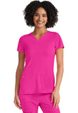 • A Contemporary fit V-neck top features rounded patch pockets with a small interior pocket, an exterior pink bungee loop and a hidden functional pink grommet and bungee loop to thread headphone cords through the inside. Also featured is double needle topstitching, a signature woven tape at the back neck, front and back princess seams and side vents. Center back length: 25 1/2".