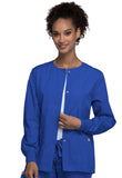 Description:A Traditional fit, round neck snap front warm-up with two patch pockets, knit cuffs, and a cell phone pocket. Center back length: 27 1/2".Fabric Content:65% Polyester / 35% Cotton PoplinGender:WomenGarment Type:Warm Up JacketSpecifications:Collection : WW OriginalsFit : TraditionalNumber of Pockets : 3 PocketsTypes of Pockets : Patch Pockets, Cell Phone Pocket, No Chest PocketManufactured In : ImportedWashInstructions:Machine wash cold with similar colors. Do not bleach. Tumble dry low. Cool iron if needed.
