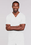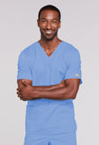 - A Unisex Traditional fit V-neck features double needle stitching. The chest pocket features an instrument holder. Also included are two patch pockets, an additional instrument/cell phone pocket on right side, back yoke and side vents. Center back length: 28"