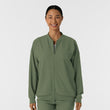 The look of your favorite off-duty jacket becomes your new work essential in this women's bomber jacket. It's made with sustainable CiCLO® polyester, a material that helps reduce the persistence of plastic microfibers in our oceans and plastic accumulation in landfills. Soft to the touch, it lets you go about your work with the peace of mind that you're also caring for the environment. Layer this jacket over your scrub top to stay warm in chilly patient rooms or air-conditioned offices. You'll have all the practicality you need thanks to double front pockets plus two interior pockets that zip shut to keep other items close and secure. Store your badge in the sleeve card pocket for easy access that keeps it out of your way, or secure it to the shoulder loop if you're required to show ID at all times. A ribbed hem and cuffs draw in the silhouette, and the full-zip front gives you options for versatile styling.