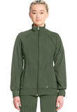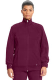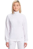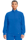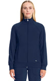 • A Contemporary fit, sporty zip front jacket features front and back shoulder yokes, front princess seams with flat piping, hidden pockets with a zipper closure, and a logo zipper pull. The back panel, collar, cuffs, and waistband are made in a stretch rib knit for extra comfort. Cover stitch detail throughout. Center back length: 26". The comfortable stretch poplin fabric and super stretchy rib knit are the perfect combo for healthcare professionals.